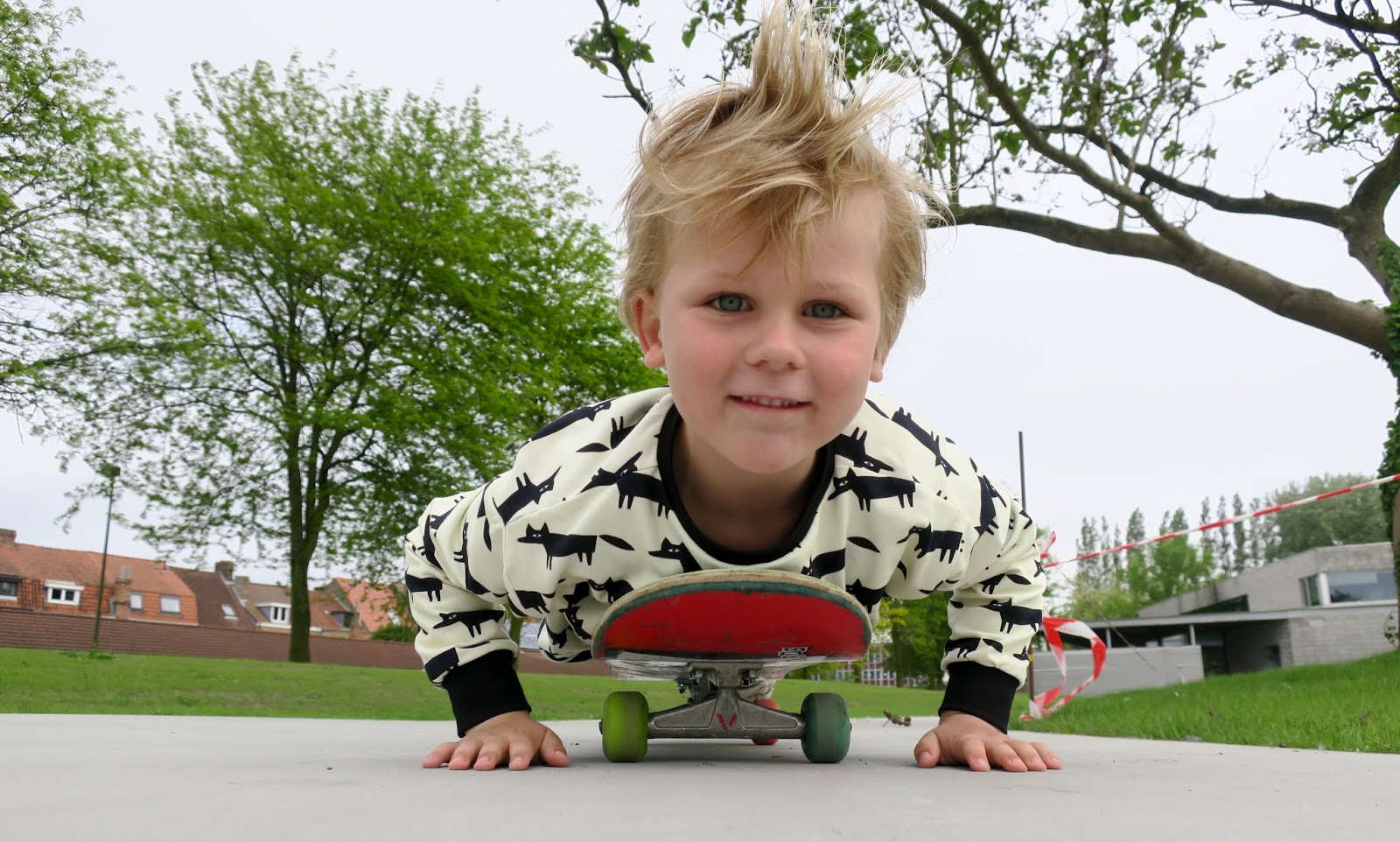 Hij wou een nieuwe trui dus zocht ik wat in mijn sweaterpatroontjes maar ik vond niet direct iets wat me aanstond. Dus tekende ik een bestaand truitje van de Zara over. Ik deed dat gemakshalve rechtstreeks op de stof, met een fluostift wat echt een bijzonder slecht idee was... Aan de goeie kant van de stof zag je mijn aantekeningen met fluostift er door... Beetje stress, beetje gevloek maar gelukkig deed een handwasje wonderen en waren alle fluostipjes en streepjes in no time weer weg. Fieuw! Los daarvan ging het naaien bijzonder vlot, voorpand, achterpand, mouwtjes en boordjes aan elkaar locken en zijn nieuwe sweater was klaar. Resultaat: 1 blij knaapje met een nieuw truitje en een lesje voor de mama: niet tekenen op stof met fluostift.